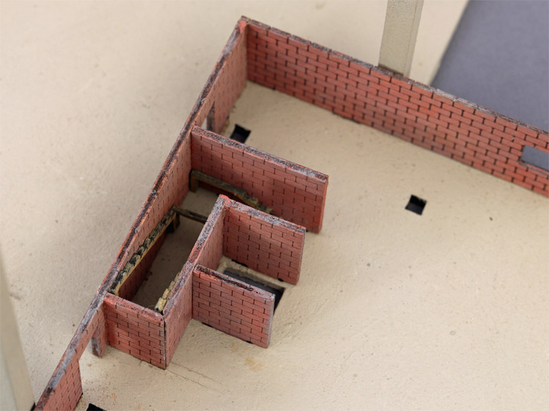 Hier seht Ihr die Pfeiler der Schnellbauhalle sowie das Erdgeschoss des Bürogebäudes. Da zur Zeit alles nur gesteckt und nicht geklebt ist, ist es zugegebenermaßen etwas windschief.